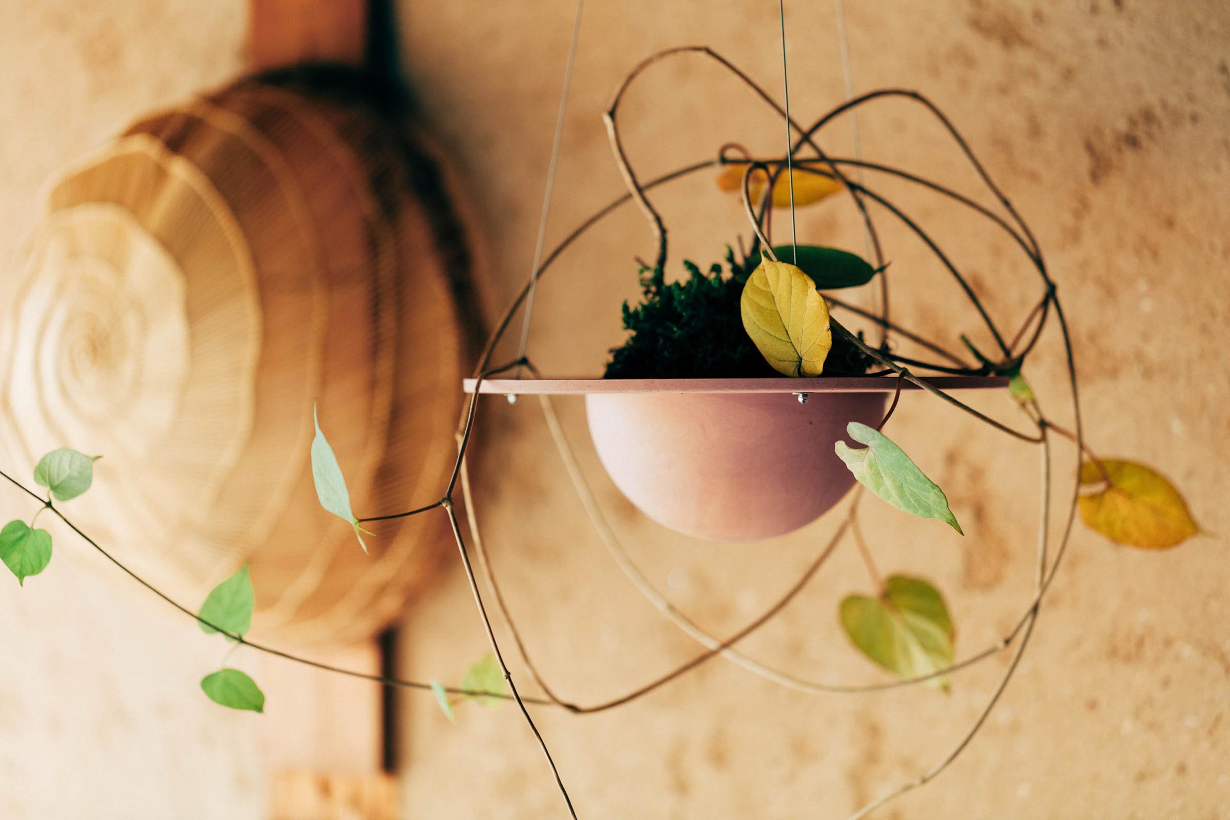 まるで宙に浮かんでいるような「UFO POT」。植物の生命力を尊重しながら、ハンギングの楽しさ、均整のとれた美しさなど、あらゆる要素を追求していくうちに、UFO(の形)に遭遇しました。半球の形状は排水効率を高める効果があり、水平にせり出したリム、モビールのような細めのワイヤー、最小限のシンプルな構造は植物を際立たせ、より一層の浮遊感を演出してくれます。キャラクターがありながらも植物との一体感があるので、インテリアの主役にも脇役にもなれる存在です。